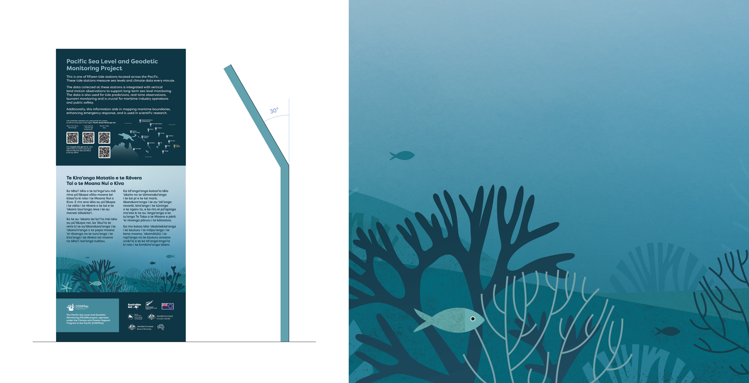 Design of informational signage for the Bureau of Meteorology’s Sea Level Monitoring Project, installed across 15 Pacific Island locations to educate communities about the program’s monitoring stations, their purpose and significance.